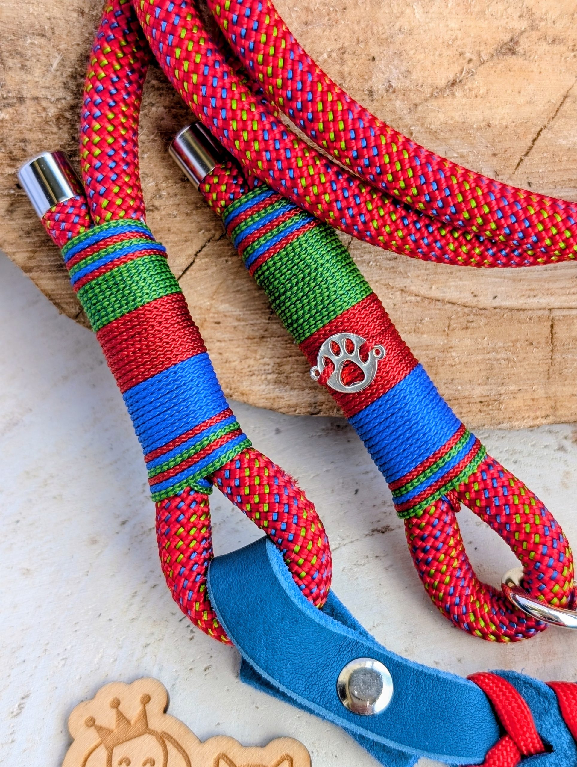 Die Wicklungen in Blau, Rot und Grün machen diese Leine zu einem absoluten Hingucker. Perfekt für alle, die ein besonderes Accessoire suchen, das ihren Hund strahlen lässt.